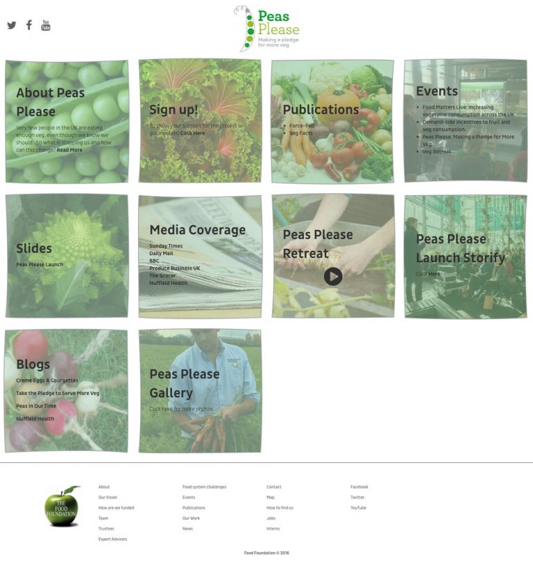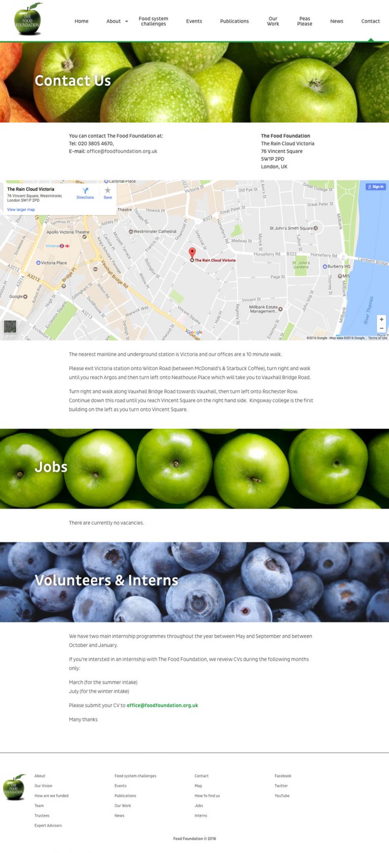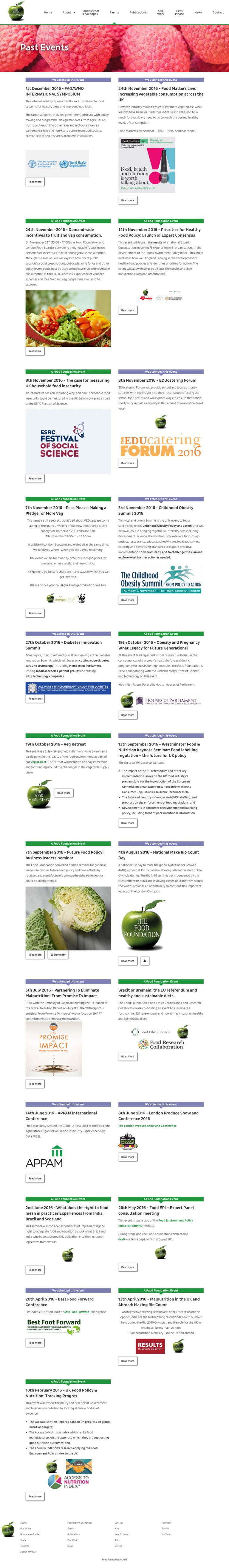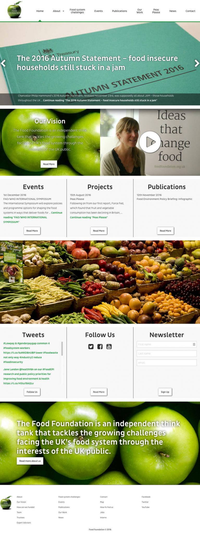 Bold design with expanses of full width images (mostly news posts and delicious looking fruit and veg) and strong brand identity running throughout. An interesting and fun website to design and build; I worked closely with Alex from Food Foundation to deliver a website that did exactly what she needed. A responsive website that works well across all devices and with some nice extra touches; like schema.org markup for address and contact details and an events page that automatically moves events from ‘Upcoming’ to ‘Past Events’ after they’ve happened.